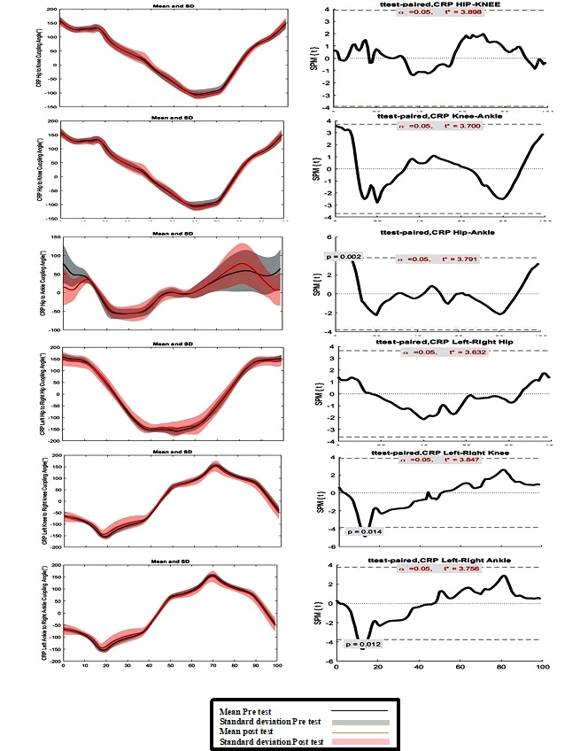 Paired-samples t-tests revealed no significant overall differences in coordination or coordination variability following fatigue (p > 0.05). However, significant differences (p < 0.05) were observed in the coordination of the hip–ankle, left knee–right knee, and left ankle–right ankle couplings, as well as in hip–knee coordination variability. SPM analyses further indicated that these significant alterations predominantly occurred during the absorption phase of the running cycle: hip–ankle coordination (0–15% of the cycle), left knee–right knee and left ankle–right ankle coordination (0–10% of the cycle), and hip–knee coordination variability (0–10% of the cycle). Conversely, no significant changes were detected in hip–knee, knee–ankle, or left hip–right hip coordination, nor in coordination variability for most couplings (except for hip–knee), despite the presence of some observable trends.