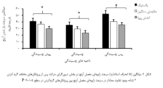 همچنین، نتایج آزمون تعقیبی بونفرونی نشان داد که سرعت زاویهای باز شدن مفصل آرنج در موقعیتهای Vmax1، Vmin و Vmax2، پس از پروتکل گرمکردن بالستیک در مقایسه با گرمکردن کشش پویا دارای مقادیر بالاتری بود. همچنین، تعادل هالتر پس از اجرای گرمکردن بالستیک، با مقادیر (