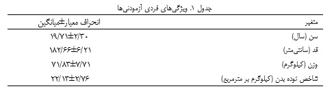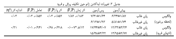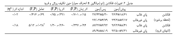 اطلاعات مربوط به ویژگی‌های فردی آزمودنی‌ها در جدول 1 نشان داده شده است. همان‌طور که در جدول 2 مشاهده می‌شود، تحلیل واریانس دوطرفه نشان داد که در متغیر فلکشن انتهای فرود، اثر تعامل زمان و نوع پا معنادار بود (p = 0.028, η² = 0.18). بررسی میانگین‌ها نشان داد که پای غالب کاهش بیشتری در فلکشن را تجربه کرده است (از 96.26 به 87.27 درجه) در مقایسه با پای غیرغالب (از 93.50 به 89.48 درجه).