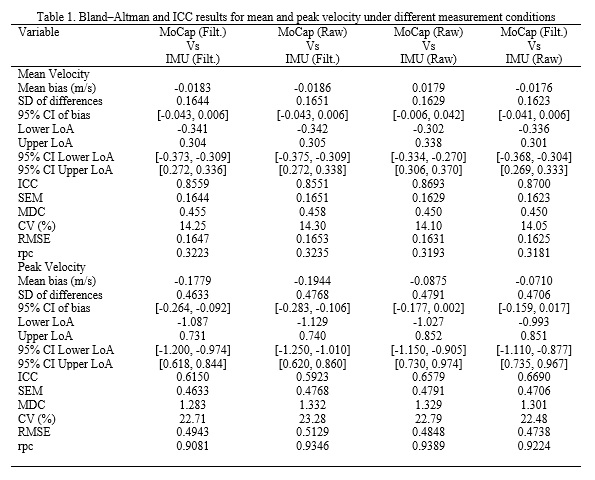 Table 1 presents the Bland–Altman and ICC analyses. For mean velocity, the mean bias between IMU and MoCap was small (≈ ±0.02 m/s), with narrow 95% confidence intervals, high ICC values (0.86–0.87), and low error indices (RMSE ≈ 0.16 m/s; CV ≈ 14%). These findings indicate excellent agreement between the two measurement systems for this variable.