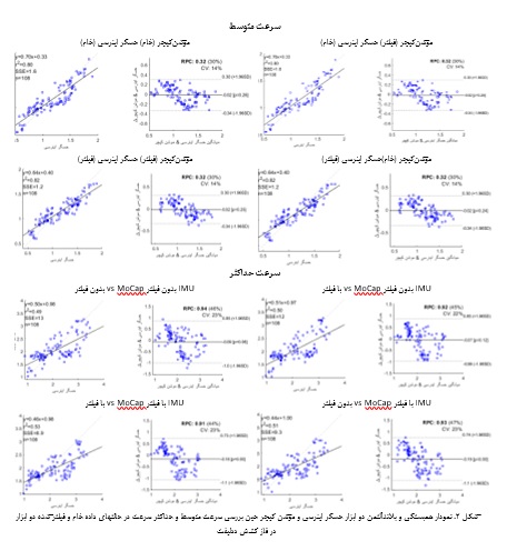 در بررسی سرعت متوسط، اثر اصلی ابزار غیرمعنادار بود و تفاوتی بین مقادیر ثبت‌شده توسط حسگر اینرسی و موشن‌کپچر مشاهده نشد. همچنین، اثر اصلی فیلتر  و اثر متقابل ابزار*فیلتر نیز معنادار نشد. این نتایج نشان می‌دهند که پردازش داده‌ها با فیلتر تأثیر چشمگیری در تغییر نتایج داشته و این اثر بسته به نوع ابزار متفاوت بوده است. در بررسی حداکثر سرعت، اثر اصلی ابزار معنادار بود و نشان داد که میانگین داده‌های حسگر اینرسی و موشن‌کپچر در این شاخص اختلاف دارند. همچنین اثر اصلی فیلتر و اثر متقابل ابزار*فیلتر نیز معنادار به دست آمدند. بنابراین، برخلاف سرعت متوسط که اختلاف ابزارها چندان معنادار نبود، در حداکثر سرعت هم تفاوت ابزار و هم اعمال فیلتر نقش معناداری در تغییر نتایج داشتند. نمودار همبستگی و بلاندآلتمن دو ابزار حسگر اینرسی و موشن کپچر حین بررسی سرعت متوسط و حداکثر سرعت در حالت‌های داده خام و فیلتر شده دو ابزار در فاز کشش ددلیفت در شکل 2 قابل مشاهده است.