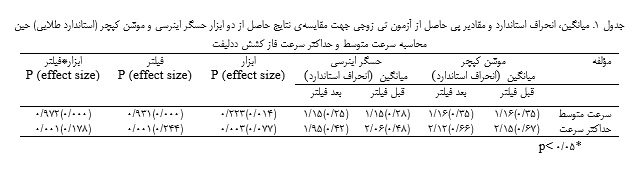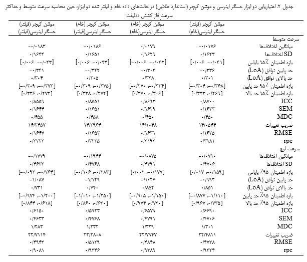 در این بخش، نتایج حاصل از مقایسه داده‌های استخراج‌شده از حسگر اینرسی و سامانه موشن‌کپچر در محاسبه سرعت میانگین و حداکثر سرعت فاز کشش حرکت ددلیفت ارائه شد. به‌منظور تحلیل حساسیت، مقایسه بین داده‌های خام و فیلترشده دو ابزار (حسگر اینرسی و سامانه موشن‌کپچر) انجام شد که نتایج آن در جدول ۱ ارائه شده است.