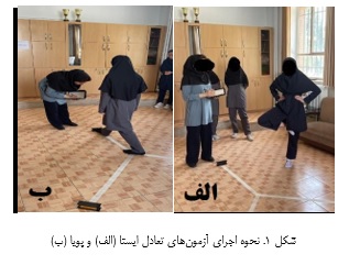 برای ارزیابی تعادل ایستا، از آزمون استورک استفاده شد. در این آزمون، آزمودنی روی پای غیر برتر خود می‌ایستاد و کف پای برتر را بر سطح داخلی زانوی پای تکیه‌گاه قرار می‌داد، به‌نحوی‌که انگشتان پا به سمت پایین قرار گیرند. دستان روی استخوان خاصره قرار می‌گرفت و آزمودنی پس از بسته‌ شدن چشم‌ها و دریافت فرمان آزمونگر، پاشنه پای تکیه‌گاه را از زمین بلند کرده و روی سینه پا تعادل خود را حفظ می‌کرد. از لحظه بلند شدن پاشنه، زمان با استفاده از کرونومتر اندازه‌گیری می‌شد. در صورت بروز هرگونه خطا نظیر باز کردن چشم‌ها، برداشتن دست‌ها از کمر، یا تماس پای آزاد با زمین، آزمون متوقف و زمان ثبت می‌شد. آزمون برای هر آزمودنی سه بار انجام شد و میانگین زمان ثبت‌شده به‌عنوان نمره نهایی تعادل ایستا در نظر گرفته شد. آزمون استورک به‌عنوان یک ابزار معتبر برای ارزیابی کنترل وضعیتی ایستا شناخته می‌شود و پایایی آن با ضریب ۶۶/۰ توسط روزیتر گزارش شده است (شکل 1؛ الف) (27).  به‌منظور ارزیابی تعادل پویا، از آزمون Y-Balance استفاده شد. در این آزمون، شرکت‌کننده بر روی پای غیر برتر خود در مرکز یک ساختار سه‌شاخه ایستاده و تلاش می‌کرد با پای آزاد، در سه جهت مختلف (قدامی، خلفی‌-داخلی و خلفی‌-خارجی) تا بیشترین حد ممکن، پا را حرکت دهد. نوارهای اندازه‌گیری در جهات مذکور به‌صورت چسبیده به زمین نصب شده بود، به‌گونه‌ای که زاویه بین دو شاخه خلفی نسبت به مسیر قدامی ۱۳۵ درجه بود. آزمودنی موظف بود پس از انجام حداکثر میزان رَسِش در هر جهت، با لمس ملایم نوک انگشت پای هدف به نوار، بدون از دست‌دادن تعادل به وضعیت اولیه بازگردد. رَسِش انجام‌شده در هر جهت ثبت شده و برای نرمال‌سازی بر طول پای آزمودنی (فاصله بین برجستگی قدامی-فوقانی لگن تا قوزک داخلی در حالت خوابیده) تقسیم و در عدد ۱۰۰ ضرب شد. میانگین سه نمره به‌دست‌آمده در سه جهت، به‌عنوان نمره نهایی تعادل پویا در نظر گرفته شد. این آزمون به‌عنوان یکی از دقیق‌ترین و پایاترین ابزارهای ارزیابی تعادل پویا شناخته می‌شود و پایایی آن در مطالعات متعدد از جمله مطالعه شافر ، بین ۸۵/۰ تا ۹۳/۰ گزارش شده است (شکل 1؛ ب) (27).