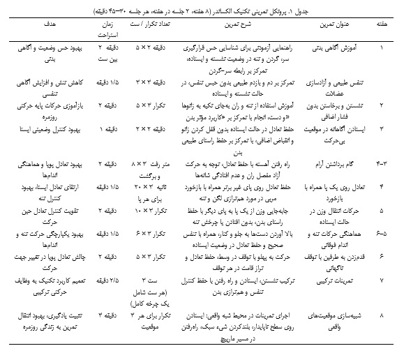 مربی در طول جلسات نقش هدایت‌گر و اصلاح‌گر داشت و با استفاده از راهنمایی‌های کلامی و تماس لمسیِ کنترل‌شده، به شرکت‌کنندگان در اصلاح الگوهای حرکتی کمک می‌کرد. تمامی اطلاعات جلسات تمرینی در حضور پژوهشگر ثبت شدند که شامل نوع تمرین، تعداد تکرار، مدت‌زمان، میزان استراحت و میزان پیشرفت هر شرکت‌کننده در طول دوره بود. در طراحی این پروتکل از مطالعات پیشین مرتبط با تکنیک الکساندر و کاربرد آن در بهبود کنترل پاسچر و تعادل در جمعیت‌های مختلف از جمله افراد مسن و بیماران دارای درد مزمن استفاده شد(20, 21) (جدول 1).
