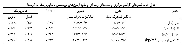 جدول 2 مقادیر شاخص های گرایش مرکزی و پراکندگی متغیرهای زمینه ای مورد بررسی را در دو گروه کنترل و تجربی نشان می-دهد. پیش‌فرض نرمال بودن توزیع داده ها با استفاده از آزمون شاپیروویلک و همگنی واریانس ها با استفاده از آزمون لون مورد بررسی قرار گرفت و نرمالیتی و همگنی واریانس های متغیرهای تحقیق مورد تأیید قرار گرفت (0.05< p). آزمون تی مستقل برای مقایسه متغیرهای زمینه ای در بین دو گروه تفاوت معناداری نشان نداد (0.05 < p)، که حاکی از همگنی ویژگی‌های جمعیت‌شناختی دو گروه در آغاز مطالعه است.