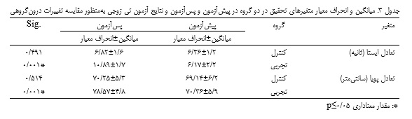 به‌منظور مقایسه نتایج درون گروهی، از آزمون تی زوجی استفاده شد. بررسی نتایج درون گروهی آزمون تی زوجی نشان داد که متغیرهای تعادل ایستا و پویای آزمودنی های گروه تجربی در گذر زمان و در مرحله پس آزمون نسبت به پیش آزمون، بهبود معنی-داری پیدا کرده است (0.05>p). به‌طوری‌که انجام 8 هفته تمرینات تکنیک الکساندر موجب افزایش مدت زمان آزمون استورک و افزایش میزان رسش در آزمون تعادل Y شده است (0.05>p). درحالی‌که در گروه کنترل، در هیچ‌یک از متغیرهای فوق، تغییری در پس آزمون نسبت به پیش آزمون مشاهده نشد (0.05<p) (جدول 3).