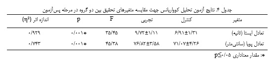 برای بررسی اثر تمرین با کنترلِ مقادیر پیش آزمون، از آزمون تحلیل کوواریانس استفاده شد. نتایج آزمون تحلیل کوواریانس نشان داد که پس از حذف اثر پیش‌آزمون، تفاوت میانگین‌های تعدیل‌شده بین دو گروه در هر دو متغیر تعادل ایستا و پویا از نظر آماری معنادار بود. برای تعادل ایستا، مقدار 45/35=(1،28) F با سطح معنی‌داری 001/0=p و اندازه اثر 929/0 η²=به‌دست آمد. میانگین تعدیل‌شده تعادل ایستا برای گروه تجربی برابر با 11/1±72/10 ثانیه و برای گروه کنترل 51/1±61/6 ثانیه بود. در خصوص تعادل پویا نیز تحلیل کوواریانس نتایج مشابهی را نشان داد، به‌طوری‌که مقدار 38/45=(1،28) F با سطح معنی‌داری 001/0=p و اندازه اثر 743/0 η²=محاسبه گردید. میانگین تعدیل‌شده تعادل پویا در گروه تجربی 18/4±82/75 سانتی متر و برای گروه کنترل 33/5±27/67 سانتی متر بود (جدول 4).