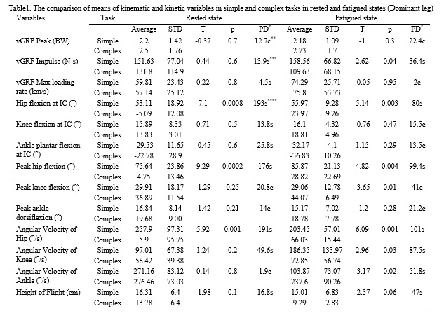 This study examined how muscle fatigue influences landing biomechanics during simple and complex tasks. The fatigue protocol produced a greater reduction in peak vertical ground reaction force (vGRF) in the simple task (13.7%) compared with the complex task (2.8%). Previous research has reported mixed effects of fatigue on vGRF, with studies showing increases, decreases, or no meaningful changes, largely depending on the type of fatigue protocol and the specific muscle groups targeted (16).
