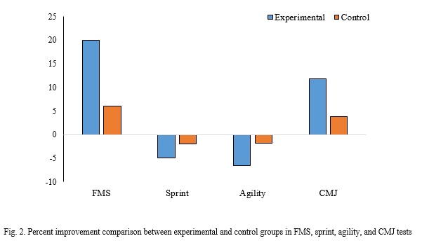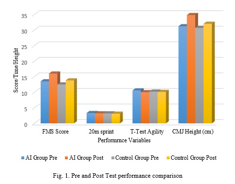 The pre- and post-test results for the experimental (AI) and control groups across the measured performance variables, along with the corresponding p-values and effect sizes, are presented in Table 3. Fig. 1 graphically illustrates the pre- and post-test performance comparisons between the experimental and control groups for FMS scores, 20 m sprint time, agility test time, and CMJ height.