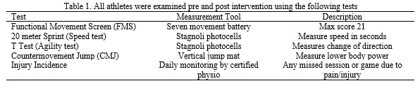 During the entire training period, injury incidence was monitored, and the nature, location, and severity of any complaints were documented by a certified physiotherapist based permanently at the academy. All athletes were assessed before and after the training period at each session. An injury was recorded when an athlete reported pain or discomfort resulting from training or competition and missed a scheduled training session or game due to this issue. All reported injuries were categorized by type and rate, but for analysis, all injuries were converted into percentages. This monitoring process ensured early intervention and equal observation of both groups for injury-related outcomes.