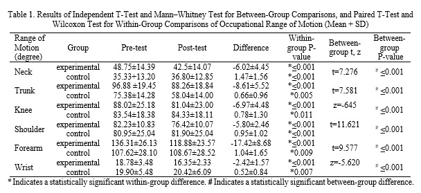 According to the results presented in Table 1, significant between-group differences (p ≤ 0.001) were observed in the range of motion of the neck, trunk, knee, shoulder, forearm, and wrist. Specifically, the range of motion in the experimental group showed a significant reduction compared to the control group. Within-group comparisons also indicated a significant decrease in all motion ranges in the experimental group (p ≤ 0.001).