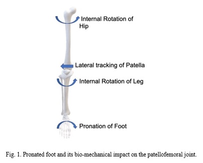 Knee pain is a prevalent musculoskeletal complaint affecting individuals across all age groups, often resulting from complex interactions between proximal, local and distal biomechanical factors (1). The proper management of knee pain depends upon its underlying etiology (2). The foot and ankle, while often overlooked in favour of larger joints like the knee and hip, play a crucial role in human biomechanics. Serving as our primary point of contact with the ground, the foot and ankle are responsible for supporting the weight of the body, absorbing shock, and facilitating various movements, example running, jumping, and walking. Ligaments around the ankle joint, such as the deltoid ligament and the anterior talofibular ligament, provide stability. Meanwhile, tendons like the Achilles tendon, connecting the calf muscles to the calcaneus, play a pivotal role in movement and propulsion (3). As the main point of contact between the body and the ground, the foot has a significant impact on the lower limb's overall biomechanics. The stresses delivered to the knee can be greatly influenced by the complex form and function of the foot. Numerous investigations have examined this issue, highlighting the link between knee pain and foot biomechanics. As the foot adjusts to the ground and absorbs shock, pronation is a typical aspect of the gait cycle. On the other hand, internal rotation of the tibia due to excessive pronation (Fig. 1) can result in malalignment and greater strain on the knee joint (4). Flatfoot, or pes planus, where there is an absence or reduction of the medial arch, can lead to overpronation, and, as mentioned, this can influence the alignment and forces at the knee joint (5).