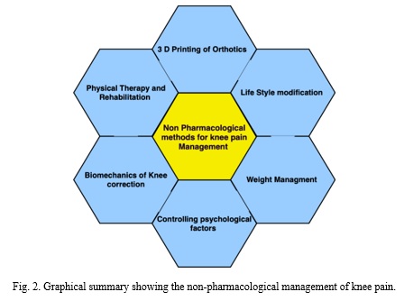 Three-dimensional (3D) printing has become a potential orthopaedic and rehabilitation technique in recent years. Its applications span from the production of patient-specific anatomical models for pre-surgical planning to the fabrication of personalized orthoses and prosthetic devices that optimize joint alignment and reduce knee loading (34). 3D-printed braces and insoles have demonstrated promise in treating knee pain by improving gait biomechanics, improving patient comfort, and offering customized mechanical support. Additionally, 3D printing allows for quick prototyping and affordable customisation, providing a non-pharmacological treatment option to supplement traditional treatments for musculoskeletal conditions (35). This review study attempts to objectively assess the effectiveness of non-pharmacological therapies and integrate current knowledge on distal biomechanical contributions to knee pain with the growing significance of 3D printing in customized rehabilitation strategies.