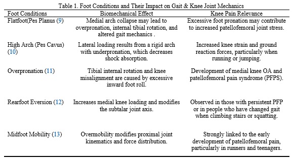 Inclusion Criteria: i. Studies examining how distal factors—such as lower limb alignment, gait mechanics, or foot and ankle morphology—contribute to the development or persistence of knee pain. ii. Studies providing data on non-pharmacological interventions, including 3D-printed orthoses, physiotherapy, footwear modification, and orthotic devices. iii. Original research (randomized controlled trials, cohort, or case–control studies) or high-quality systematic and narrative reviews.