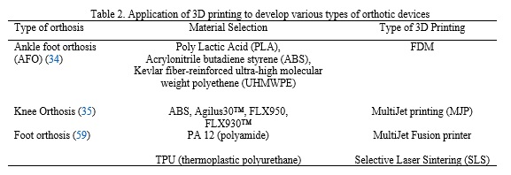 3D printing offers key advantages such as personalized customization, rapid prototyping, and high anatomical precision, making it a transformative technology in orthotic design (54–55). Despite its promise, 3D printing remains cost-intensive and lacks sufficient evidence from large-scale randomized controlled trials (56). Additionally, 3D printing’s strengths—such as fast production cycles, reproducibility, biodegradable adaptive materials, and minimal material waste (Fig. 3)—extend its application beyond orthoses to surgical templates, implants, and anatomical models. The incorporation of composite materials, such as carbon or glass fiber fillers, further enhances the structural strength and flexibility of these devices, tailoring them to specialized orthopedic requirements (57). Details are summarized in Table 2. Studies confirm that customized 3D-printed insoles outperform prefabricated models in both comfort and biomechanical correction, particularly by achieving a more even distribution of plantar loads. Reported adverse effects are minimal, suggesting that these insoles serve as a reliable and well-tolerated adjunct to physiotherapy interventions (58).