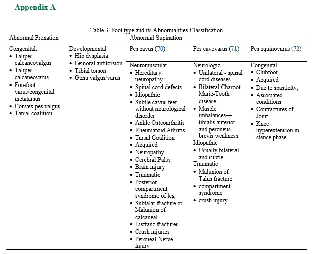 High Arches or Pes Cavus feet with high arches tend to underpronate (or supinate), causing the foot to be less effective at shock absorption. This can transmit increased forces to the knee, especially during high-impact activities, potentially leading to conditions like patellofemoral pain syndrome (6). The type and fit of footwear can influence foot and ankle biomechanics. Poorly fitted or unsupportive shoes might exacerbate abnormal foot biomechanics, leading to altered knee kinetics and kinematics. Elevated heels, for instance, can anteriorly tilt the pelvis, increasing knee flexion (7). Foot biomechanics plays a significant role in knee health. There may be alterations in knee biomechanics as a result of abnormalities or deviations in the anatomy or function of the foot, often resulting in pain or injury. Recognising the role of the foot can guide interventions and preventive strategies in managing knee pain. While appearing uniform in general structure, the human foot can exhibit a wide array of shapes and abnormalities. Such variations often arise from genetic factors, wear and tear, injuries, or even the choice of footwear. Understanding the different foot types and potential abnormalities is vital, as they can significantly influence gait, postural stability, and predisposition to musculoskeletal issues. When an individual with a standard foot type stands or walks, the foot pronates correctly to absorb shock and pressure, which is distributed fairly evenly throughout the foot (8). The different types of abnormal foot conditions have different impacts on gait and knee joint mechanics (Table 1). The classifications of other congenital and developmental foot conditions are attached as Appendix A.