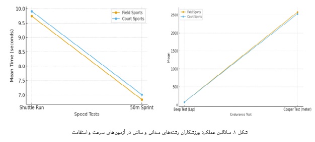نتایج آزمون t  مستقل (جدول ۳) نشان داد که بین ورزشکاران رشته‌های میدانی و سالنی از نظر سرعت و استقامت تفاوت معناداری وجود ندارد. نتایج مربوط به سرعت در آزمون رفت‌وبرگشت (t(58) = -1.33, p = .188) و دو سرعت ۵۰ متری (t(58) = -1.41, p = .163) حاکی از عدم وجود تفاوت آماری قابل توجه بین دو گروه بود. به همین ترتیب، عملکرد استقامتی در آزمون بپ (t(58) = 0.30, p = .769) و آزمون کوپر (t(58) = 0.63, p = .534) نیز تفاوت معناداری بین دو گروه نشان نداد. با این حال، در تمامی آزمون‌ها، بازیکنان رشته‌های میدانی میانگین عملکرد کمی بالاتر از همتایان سالنی خود داشتند (شکل1).