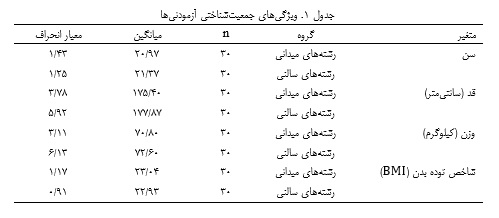 ورزشکاران مرد ۱۸ تا ۲۵ ساله از دانشگاه علوم و فناوری جشور، بنگلادش، به‌صورت تصادفی انتخاب شدند و نمونه به دو گروه مساوی تقسیم گردید: گروه ورزش‌های سالنی (30 = n) شامل بازیکنان بسکتبال، هندبال و والیبال، و گروه ورزش‌های میدانی (30 = n) شامل بازیکنان کریکت، فوتبال و دوومیدانی (جدول 1). تمامی شرکت‌کنندگان در رقابت‌های بین‌دانشگاهی فعال بودند و در سطوح تمرینی مشابهی قرار داشتند، به‌گونه‌ای که از برنامه‌های تمرینی نسبتاً یکسانی پیروی می‌کردند و از نظر آمادگی بدنی پایه قابل مقایسه بودند. پیش از ورود به مطالعه، شرکت‌کنندگان از طریق پرسش‌نامه آمادگی فعالیت بدنی (PARQ) مورد غربالگری قرار گرفتند و تنها افرادی که از سلامت جسمی و روانی کامل برخوردار بودند در مطالعه شرکت داده شدند. محرمانگی اطلاعات، ایمنی و رضایت آگاهانه کتبی تمام آزمودنی‌ها تضمین گردید.