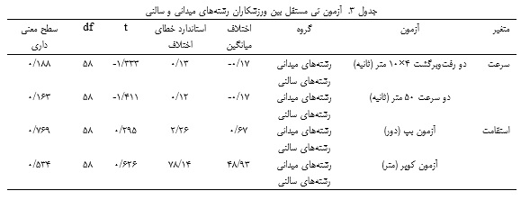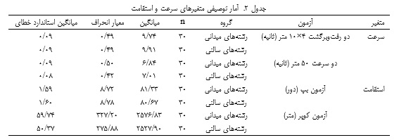 جدول ۲ آمار توصیفی مربوط به متغیرهای سرعت و استقامت در میان بازیکنان رشته‌های میدانی و سالنی را نشان می‌دهد. به طور کلی، نتایج آماری توصیفی بیانگر آن است که بازیکنان رشته‌های میدانی در هر دو شاخص سرعت و استقامت، عملکردی اندکی بهتر از بازیکنان رشته‌های سالنی داشتند.