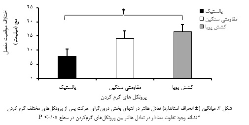 F = 20.2, p = 0.001, η² = 0.44، شکل 3) اختلاف معناداری را در مقایسه با سایر پروتکلها نشان داد و حفظ بهتر تعادل و کمترین اختلاف موقعیت مچ دستان پس از اجرای این پروتکل در مقایسه با دو پروتکل دیگر حاصل گردید. همچنین، پس از اجرای پروتکل مقاومتی سنگین باوجود ایجاد بهتر تعادل در مقایسه با پروتکل کششی پویا، اختلاف معناداری مشاهده نشد (