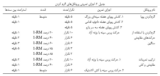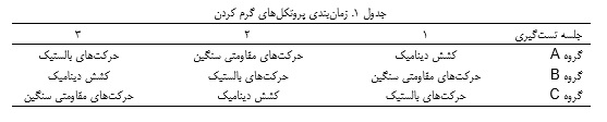 پس از تعیین 1-RM برای هر آزمودنی، آزمودنیها با استفاده از پروتکل پیشنهادی امیری خراسانی و گالیک (2015)، به سه گروه 6 نفره A،B و C بهصورت تصادفی تقسیم شدند (17) و در سه روز جداگانه، پس از 48 ساعت عدم فعالیت سنگین، با اجرای فرایندهای پژوهش، شامل گرمکردن عمومی بدن، اجرای پروتکلهای گرمکردن بالستیک با استفاده از کش الاستیک (CX mega fitness MF107) با باری تقریباً معادل 30 کیلوگرم در انتهای بخش درونگرای حرکت، مقاومتی سنگین (با استفاده از میز پرس سینه، هالتر و صفحات وزنه آزاد) و کشش پویای عضلات اصلی درگیر در حرکت مورد ارزیابی قرار گرفتند. جدول 1 زمانبندی پروتکلهای گرمکردن و جدول 2 اجزای تمرینی پروتکلهای گرمکردن را برای سه گروه آزمودنی نشان میدهند. مدتزمان استراحت بین گرمکردن و حرکت اصلی با توجه به پژوهش اولریچ و پارستورفر (2018)، 8 دقیقه در نظر گرفته شد (15). آزمودنیها پس از اجرای پروتکل گرمکردن و 8 دقیقه استراحت، بر پایه پژوهش ون دن تیلار و ساترباکن (2012)، با استفاده از 6 مارکر پسیو انعکاسی با قطر 19 میلیمتر که بر روی نقاط آناتومیکی دست راست و چپ، شامل رأس خارجی زائده آخرومی کتف، اِپی کندیل خارجی استخوان بازو و زائده نیزهای استخوان زند زیرین قرار گرفت، مارکر گذاری شدند. همچنین، 2 مارکر باهدف اندازهگیری سرعت خطی هالتر به فاصله 20 سانتیمتر از وسط هالتر نصب گردیدند (2). سپس، آزمودنیها یک تکرار بیشینه خود در حرکت پرس سینه در فضای کالیبره شده سیستم تصویربرداری سهبعدی کینماتیک را اجرا نمودند. زاویه داخلی مفاصل آرنج، موقعیت مکانی مچ دستان آزمودنیها و هالتر در فضای سهبعدی در هنگام اجرای 1-RM حرکت پرس سینه بهوسیله سیستم آنالیز سهبعدی حرکت، ساخت کشور آمریکا با مدل Digital Real Time System Raptor-H با شش دوربین اپتوالکترونیک مادونقرمز ثبت گردید و دادهها توسط نرمافزار متلب نسخه R2022a مورد پردازش قرار گرفت. پس از تعیین سرعت خطی هالتر در بخش درونگرای حرکت، با استفاده از پروتکل ون دن تیلار و اتما (2009) ناحیههای پیش چسبندگی، چسبندگی و پس چسبندگی تعیین گردید (4). سپس، سرعت زاویهای مفصل آرنج در بخش درونگرای حرکت، محاسبه شد. جهت به دست آوردن متغیر تعادل هالتر ابتدا بیشترین زاویه باز شدن آرنجها در بخش درونگرای حرکت با استفاده از نرمافزار متلب تعیین شد و در این زاویه، اختلاف موقعیت عمودی مچ دستان در راستای محور مختصات عمودی (Z) بهعنوان شاخص تعادل هالتر در انتهای بخش درونگرای حرکت تعیین شد. در پایان پردازش، دادهها با استفاده از نرمافزار SPSS نسخه 25 مورد تجزیهوتحلیل آماری قرار گرفتند.