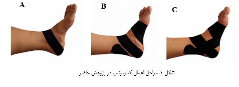 قبل از اعمال تیپ، ناحیه مورد نظر تراشیده و با الکل پاک‌سازی شد. تمامی مراحل اعمال کینزیوتیپ توسط یک متخصص که از طرح تحقیق مطلع نبود انجام شد تا از برقراری شرایط یکسان و هماهنگی در بین همه شرکت‌کنندگان اطمینان حاصل شود. به‌طور کلی، در مطالعه حاضر اعمال کینزیوتیپ و پای آزمایش در پای راست بود؛ لازم به ذکر است که در مطالعه حاضر تمامی شرکت‌کنندگان بی‌ثباتی یک‌طرفه در پای راست داشتند. تشخیص پای برتر با آزمون شوت توپ تعیین شد (23). اعمال کینزیوتیپ مطابق با مطالعه لی و همکاران (2017) انجام شد و پایداری مفصل مچ پا با تنظیم حرکات دورسی‌فلکشن، اورژن و اینورژن در چهار مرحله انجام شد (21). اول، برای لغزش خلفی تالار درحالی‌که مچ پا در حالت دورسی‌فلکشن خفیف قرار داشت نوار کینزیوتیپ از تالوس تا استخوان پاشنه اعمال شد (شکل 1-A). دوم، برای اینورژن مچ پا، نوار کینزیوتیپ از پنج سانتی‌متری بالای قوزک داخلی به سمت استخوان خارجی پاشنه و روی پا اعمال شد (شکل 1-B)؛ در این مرحله مچ پا در حالت اینورژن خفیف قرار داشت. سوم، برای اورژن مچ پا، نوار کینزیوتیپ از پنج سانتی‌متر بالای قوزک خارجی به سمت استخوان داخلی پاشنه و سپس روی پا اعمال شد (شکل 1-C)؛ در این مرحله مچ پا در حالت اورژن خفیف قرار داشت. چهارم، درحالی‌که مچ پا در حالت دورسی‌فلکشن خفیف قرار داشت نوار کینزیوتیپ از بر روی اولین ناحیه نوار اعمال شد، به‌طوری‌که 100٪ نوار اول را پوشش داد تا حمایت مچ پا و لغزش خلفی تالار را افزایش دهد (21).