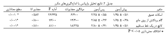 تجزیه‌وتحلیل داده‌ها با نرم‌افزار SPSS نسخه 26 انجام شد. در ابتدا، توزیع نرمال داده‌ها با آزمون شاپیروویلک بررسی گردید. سپس، از روش آماری آنالیز واریانس با اندازه‌گیری مکرر برای مقایسه داده‌ها در دو مرحله قبل و بعد از تیپینگ استفاده شد. در تمامی تجزیه‌وتحلیل‌های آماری سطح معناداری 0/05 در نظر گرفته شد. اندازه اثر بر اساس شاخص کوهن تفسیر شد؛ بدین ترتیب که اندازه اثر کوچک 20/0<، متوسط 79/0- 21/0 و بزرگ 80/0> در نظر گرفته شد (24).