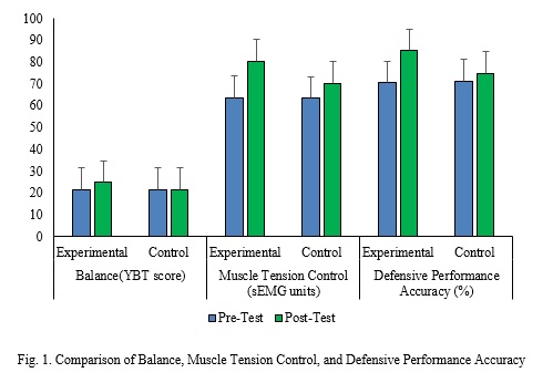 Furthermore, the biomechanical implications of integrated training are supported by recent research in robotics and musculoskeletal modeling. Kawaharazuka et al. (2024) proposed a method for learning balance control in musculoskeletal humanoids by considering changes in body state, joint angles, and muscle tension (39). This approach highlights the importance of dynamic muscle control and joint alignment in maintaining balance, which is directly applicable to athletic performance. Their findings underscore the relevance of muscle tension control in optimizing movement efficiency and preventing injury, paralleling the outcomes observed in this study (32). The fourth objective, improving defensive performance accuracy, is clearly confirmed in Table 3, where the experimental group achieved the highest effect size. This indicates that integrating balance and Muscle tension training has a direct and substantial impact on sport-specific skills, such as anticipating and responding to opponent attacks. These results expand on earlier isolated findings by showing that a combined intervention yields even greater performance gains (40). The integrated training program not only enhances defensive performance but also contributes to overall athletic development, improving movement efficiency in both offensive and defensive phases of the game (41).