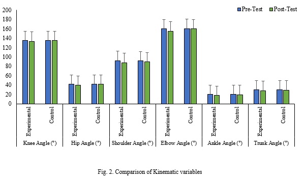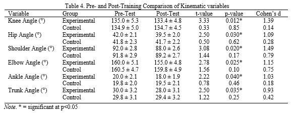 In practical terms, adopting the integrated training model tested in this study could lead to, enhanced on-court agility and balance under competitive pressure, Reduced injury risk through improved joint alignment and neuromuscular control, and Improved match performance, especially in defensive roles, where quick, accurate responses are crucial. By systematically applying the methods validated by the outcomes in Table 3 and Table 4, volleyball coaches and strength & conditioning specialists can develop more comprehensive training programs that address both biomechanical efficiency and sport-specific skill execution. Both Table 3 and Table 4 highlight the effectiveness of the integrated training program in improving balance, muscle tension control, defensive skill accuracy, and several kinematic variables. The experimental group showed significant improvements across all variables, with large effect sizes, while the control group showed minimal to no significant changes. These findings suggest that the training program had a substantial impact on both the athletes' physical mechanics and performance outcomes, supporting previous research on the benefits of integrated training programs for athletes (2,43).