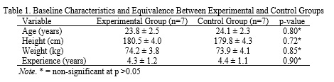 The sample consisted of fourteen male first-division volleyball players from Al-Jaish Sports Club, purposively selected to ensure homogeneity in competitive level and training background. All participants signed informed consent forms after receiving a full explanation of the study’s aims, procedures, and potential risks and benefits. A priori sample size estimation was conducted using G*Power software based on an expected medium effect size (f = 0.25), an alpha level of 0.05, and a desired power of 0.80 for repeated-measures ANOVA with two groups and two measurement points. The analysis indicated that a minimum of 24 participants would be required to achieve adequate statistical power. However, due to the fact that the club roster included only 14 players, the sample size could not be expanded. This limitation may restrict the generalizability of the results to other teams or competitive levels. Nevertheless, the use of reliable and validated measurement tools ensured robust findings within the specific context of the available sample. An integrated training program was utilized by the experimental group (n = 7) while control group participants (n = 7) continued with standard training. As showed in Table 1, there were no significant between-group differences when comparing age, height, weight and training experience at the baseline measurement level reflecting their equivalence before the intervention period.