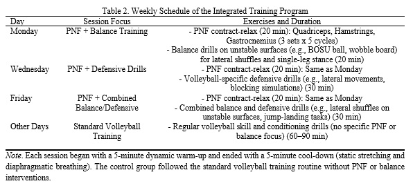 The PNF exercises were performed on stable surfaces to ensure safety and focus on muscle tension modulation, with the coaching staff providing verbal cues to maintain proper form and breathing rhythm. This protocol was designed based on established research demonstrating the efficacy of PNF in improving neuromuscular efficiency and reducing unnecessary muscle tension during dynamic tasks. outlines the weekly structure of the integrated training program, combining PNF, balance exercises, and sport-specific drills over the 6-week intervention period as show in table 2.