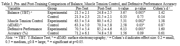 All statistical analyses were performed using SPSS (ver. 26). Paired t-tests were used to compare pre- and post-test scores within each group, while independent t-tests were used to compare post-test differences between the experimental and control groups. Cohen’s d was calculated to determine the effect size of the intervention. The primary variables analyzed included: dynamic balance (YBT composite score), muscle activation (RMS sEMG), kinematics variables (knee, hip, shoulder, elbow, ankle, and trunk angles), and defensive skill accuracy.