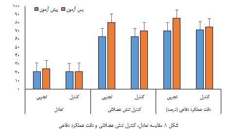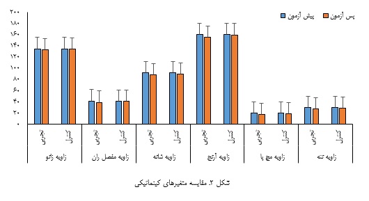 شکل ۲ مقایسه متغیرهای کینماتیکی بین گروه‌های تجربی و کنترل را در آزمون‌های پیش و پس از تمرین نشان می‌دهد. همان‌گونه که در شکل مشاهده می‌شود، در گروه تجربی زوایای اکثر مفاصل مانند زانو، شانه، آرنج و تنه پس از دوره تمرینی تغییرات معناداری داشته‌اند، در حالی‌که تغییرات در گروه کنترل اندک یا تقریباً ثابت باقی مانده است. این یافته‌ها نشان می‌دهند که برنامه تمرینی باعث بهبود الگوهای زاویه‌ای مفاصل در حرکات دفاعی شده است.