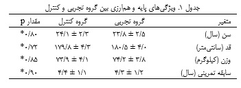 نمونه شامل چهارده بازیکن مرد از تیم لیگ برتر والیبال باشگاه ال‌جیش عراق بود که به‌صورت هدفمند انتخاب شدند تا از یکنواختی از نظر سطح رقابت و سابقه تمرینی اطمینان حاصل شود. همه شرکت‌کنندگان پس از آگاهی کامل از اهداف، روش‌ها، خطرات احتمالی و مزایای پژوهش، فرم رضایت‌نامه آگاهانه را امضا کردند. برای برآورد حجم نمونه پیش از انجام پژوهش، از نرم‌افزار G*Power  استفاده شد. محاسبات بر اساس اندازه اثر متوسط (25/0)، سطح معناداری 05/0 و توان آماری 80/0 برای تحلیل واریانس با اندازه‌گیری‌های تکراری (دو گروه و دو زمان اندازه‌گیری) انجام شد. نتایج نشان داد که برای دستیابی به توان آماری مناسب، حداقل به 24 شرکت‌کننده نیاز است. با این حال، به‌دلیل محدود بودن تعداد بازیکنان تیم به 14 نفر، افزایش حجم نمونه ممکن نبود. این محدودیت می‌تواند قابلیت تعمیم نتایج را به سایر تیم‌ها یا سطوح رقابتی کاهش دهد. با این وجود، استفاده از ابزارهای اندازه‌گیری معتبر و پایا، یافته‌های پژوهش را در چارچوب نمونه موجود قابل اعتماد می‌سازد. گروه تجربی (7 = n) برنامه تمرینی تلفیقی را اجرا کرد و گروه کنترل (7 = n) تمرینات معمول خود را ادامه داد. همان‌گونه که در جدول 1 مشاهده می‌شود، در مقادیر پایه بین دو گروه از نظر سن، قد، وزن و سابقه تمرینی اختلاف معناداری وجود نداشت و این موضوع نشان‌دهنده هم‌ارزی گروه‌ها پیش از شروع دوره مداخله بود.