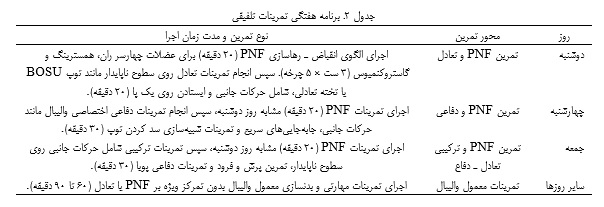 پیش از آغاز آزمون‌های اصلی، تمامی شرکت‌کنندگان در یک جلسه آشنایی ساختارمند شرکت کردند تا با مراحل اجرای آزمون‌ها آشنا شوند و اثر یادگیری به حداقل برسد. در این جلسه، نحوه اجرای آزمون تعادل Y اندام تحتانی (YBT) و وظایف حرکتی دفاعی به‌صورت کامل توضیح داده شد و سپس تمرین تحت نظارت انجام گرفت. در این مرحله، وضعیت صحیح بدن، نحوه اجرای حرکت و قوانین مربوط به هر وظیفه به شرکت‌کنندگان آموزش داده شد و بازخورد لازم برای اصلاح حرکات غیر استاندارد ارائه گردید. هر جلسه تمرین یا آزمون برای هر شرکت‌کننده حدود دو ساعت به طول انجامید. گروه تجربی به‌مدت شش هفته یک برنامه تمرینی تلفیقی را اجرا کرد که شامل تمرینات تعادل بر روی سطوح ناپایدار، کشش‌های تسهیل عصبی ـ عضلانی حس عمقی (PNF) و تمرینات کنترل تنش عضلانی بود. در این برنامه تمرینی، از تکنیک‌های PNF  برای بهبود کنترل تنش عضلانی استفاده شد. هدف از این بخش، بهینه‌سازی تعادل بین انقباض و آرام‌سازی عضلات بود. در پروتکل PNF از الگوی «انقباض ـ رهاسازی» برای تقویت هماهنگی عصبی ـ عضلانی و کاهش هم‌انقباضی‌های غیرضروری در حین حرکات دفاعی خاص والیبال مانند حرکات جانبی، سدکردن توپ و فرود پس از پرش استفاده شد. این پروتکل بر عضلات چهارسر، همسترینگ و گاستروکنمیوس داخلی تمرکز داشت، زیرا این عضلات نقش مهمی در حفظ پایداری پاسچرال و اجرای حرکات انفجاری در والیبال دارند.