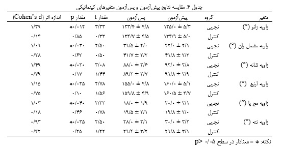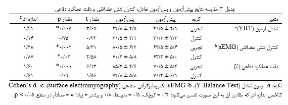 کلیه تحلیل‌های آماری با استفاده از نرم‌افزار SPSS نسخه ۲۶ انجام شد. برای مقایسه نتایج پیش‌آزمون و پس‌آزمون در هر گروه، از آزمون t همبسته استفاده شد و برای مقایسه تفاوت‌های پس‌آزمون بین دو گروه تجربی و کنترل، از آزمون t مستقل بهره گرفته شد. همچنین، به‌منظور تعیین اندازه اثر مداخله، شاخص اندازه اثر کوهن محاسبه گردید. متغیرهای اصلی مورد تحلیل شامل موارد تعادل پویا (امتیاز ترکیبی آزمون (YBT)، فعالیت عضلانی (مقادیر RMS حاصل از sEMG)، متغیرهای کینماتیکی (زاوایای زانو، ران، شانه، آرنج، مچ پا و تنه) و دقت عملکرد دفاعی بودند.