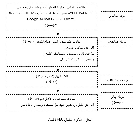 مطالعه حاضر از نوع مروری سیستماتیک و فراتحلیل (متاآنالیز) بود، جستجوی مقالات به زبان فارسی و لاتین از ابتدای ماه می سال 2010 تا ابتدای ماه اوت 2025 بود که در پایگاه‌های تخصصی ازجمله: PubMed،WOS ، Scopus ، SID،Magiran ،ISC  Science Direct,، JCR و Google Scholar انجام گرفت. به علاوه تحقیقاتی که در این پژوهش مورد بررسی و ارزیابی قرار گرفته اند از نوع پژوهشی اصیل و کارآزمایی بالینی بودند. برای هر بانک اطلاعاتی از استراتژی جست و جوی مخصوص و مناسب آن استفاده شد، به  نحوی که در جست وجوی الکترونیکی پایگاه های استنادی از MESH وFree Text  کلیدواژه ها استفاده شد. برای استخراج مقالات از کلیدواژه‌های بازسازی ، رباط صلیبی قدامی ، دویدن، نیروی عکس العمل زمین ، الکترومایوگرافی  استفاده شد. در جستجوی اولیه در پایگاه‌های اطلاعاتی، ۷۵۴ مقاله شناسایی شد، از این تعداد، ۷۲۸ مقاله به دلایل: 1- عدم ارتباط موضوعی با سؤال تحقیق مطالعه روی فعالیت‌هایی غیر از دویدن، مانند پرش یا راه رفتن. 2- عدم گزارش معیارهای بیومکانیکی مورد نظر این متاآنالیز (مانند نیروی عکس العمل زمین، کینماتیک زانو و فعالیت الکتریکی عضلات). 3- نوع مطالعاتی که گروه کنترل سالم نداشتند. 4- عدم دسترسی به متن کامل مقاله. 26 مقاله مرتبط بر اساس معیارهای ورود و خروج انتخاب شدند. معیار ورود به مطالعه شامل مواردی از قبیل: 1- استفاده از مطالعاتی که آزمودنی آن ها بازسازی رباط صلیبی قدامی داشتند. 2- مقالاتی که آزمودنی ها مبتلا به سایر ناهنجاری ها نبودند. 3- مطالعه هایی که فایل آن‌ها در دسترس بود به‌عنوان معیارهای ورود مطالعه حاضر اتخاذ گردید درحالی‌که مقالاتی که آزمودنی‌ها مبتلا به سایر ناهنجاری‌های بدن بودند و یا سابقه آسیب در اندام فوقانی و تحتانی داشتند از مطالعه خارج شدند. با توجه به معیارهای ورود و خروج ذکر شده در نهایت 10 مقاله در ارتباط با انواع پروتکل تمرینی در خصوص افراد با بازسازی رباط صلیبی قدامی مورد بررسی قرار گرفت. بر اساس دیاگرام شماره 1، مراحلی که پژوهشگران به‌منظور ارزیابی کیفیت مقالات انجام داده‌اند نشان داده شده است. هدف اصلی محققان در گام اول، جستجو کلیدواژه‌های مناسب و تعیین استراتژی‌های جستجو بود. طی گام دوم، هدف پژوهشگران بررسی مقالات جستجو شده بر اساس کلیدواژه‌ها بود، در این مرحله نویسندگان تمامی مقالات را در پوشه‌های جداگانه دسته-بندی کردند. در گام سوم ارزیابی کیفیت مقالاتی که معیارهای ورود به مطالعه را داشتند، توسط پرسشنامه دان و بلک مورد بررسی قرار گرفت (9). در این مرحله دو داور به‌صورت کاملاً جداگانه به ارزیابی و نمره دهی مقالات بر اساس پرسشنامه یاد شده پرداختند. در گام بعدی در خصوص اختلاف‌هایی که در خصوص نمره دهی مقالات وجود داشت توسط داور نهایی ارزیابی شد. در گام نهایی، نویسندگان با مطالعه مجدد و دقیق مقالات به بررسی و یادداشت نمودن نکات کلیدی به‌منظور تسهیل در روند نگارش مطالعه حاضر پرداختند (شکل 1).