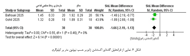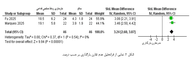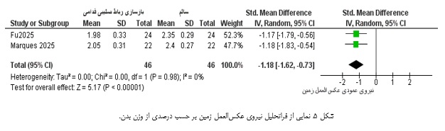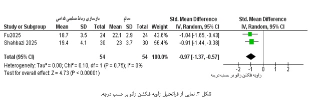 ب) زاویه فلکشن زانو در لحظه تماس با زمین: متاآنالیز انجام‌شده نشان داد که زاویه فلکشن زانو در لحظه تماس اولیه در پای عمل‌شده به‌طور معناداری بیشتر از پای سالم است. این افزایش که به‌طور میانگین بین ۳ تا ۵ درجه برآورد شد، یک الگوی ثابت در اکثر مطالعات بود و در بازه زمانی ۱۲ تا ۱۸ ماه پس از جراحی همچنان مشاهده می‌شد. از نظر مکانیکی، این افزایش فلکشن احتمالاً یک استراتژی محافظتی برای کاهش گشتاورهای اکستنشن و بارهای برشی قدامی روی گرافت بازسازی‌شده محسوب می‌شود. بااین‌وجود، این سازگاری می‌تواند کارایی بیومکانیکی دویدن را از طریق کاهش سفتی مفصل زانو و افزایش اتلاف انرژی کاهش دهد. شایان ذکر است که ناهمگونی متوسط تا بالایی بین مطالعات مشاهده شد (%68=I2)، که می‌تواند ناشی از تفاوت در پروتکل‌های دویدن یا زمان‌بندی ارزیابی پس از جراحی باشد.