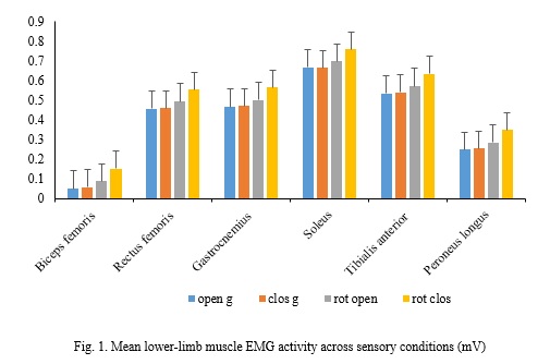 Patterns of muscle activation across the four sensory conditions are illustrated in Fig. 1. Vestibular perturbation clearly influenced the electrical activity of lower-limb muscles during the stance phase of gait. Among the four conditions examined, the eyes-closed with vestibular perturbation condition elicited the highest neuromuscular demand. This was reflected in substantial increases in muscle activation, particularly in muscles responsible for postural stabilization and maintenance of mediolateral balance. As shown in Fig. 1, the soleus muscle demonstrated the greatest response to vestibular challenges, reaching a mean activation of 0.7572 mV/s. This elevated activity suggests that children relied heavily on the ankle plantarflexors to compensate for the reduced reliability of vestibular and visual input. Increased activation was also observed in the biceps femoris and peroneus longus, indicating enhanced recruitment of both posterior-chain and lateral stabilizing muscles when balance became more challenging. Statistical analyses confirmed that the differences in muscle activity across the sensory conditions were significant at p < 0.01. This finding indicates that vestibular disturbances produced measurable and meaningful alterations in neuromuscular control during the stance phase of walking. The consistent rise in muscle activation under perturbed conditions—particularly in the absence of vision—reflects the increased postural difficulty imposed by reduced vestibular function. Overall, the findings depicted in Fig. 1 demonstrate that vestibular perturbation disrupts normal gait regulation, prompting children to increase activation in specific lower-limb muscles involved in stability, joint protection, and control of sway. These results highlight the essential contribution of vestibular input to maintaining coordinated muscle function during gait and underscore the susceptibility of children’s neuromuscular systems to balance-related challenges.