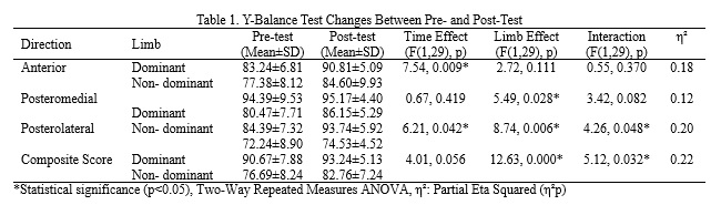The results of the repeated measures analysis of variance in Table 1 showed that Y-balance in the anterior direction (η² = 0.18, P = 0.009) and posterolateral direction (η² = 0.20, P = 0.042) significantly improved in the post-test. Additionally, significant differences were observed between the dominant and non-dominant limbs in the posteromedial direction (P = 0.028), posterolateral direction (P = 0.006), and total score (P < 0.001 in the pre-test and P = 0.032 in the post-test). A significant interaction effect was observed only in the posterolateral direction (P = 0.048), indicating a greater improvement in the dominant limb compared to the non-dominant limb.