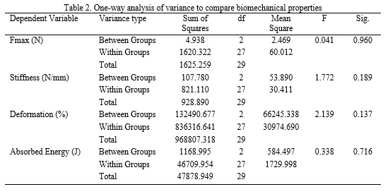 The Shapiro–Wilk test confirmed normal data distribution, and Levene’s test indicated homogeneity of variances, thereby satisfying the assumptions for ANOVA. One-way ANOVA revealed no significant effects of vitamin D supplementation on Achilles tendon Fmax, stiffness, absorbed energy, or deformation (p > 0.05; Tables 1 and 2).